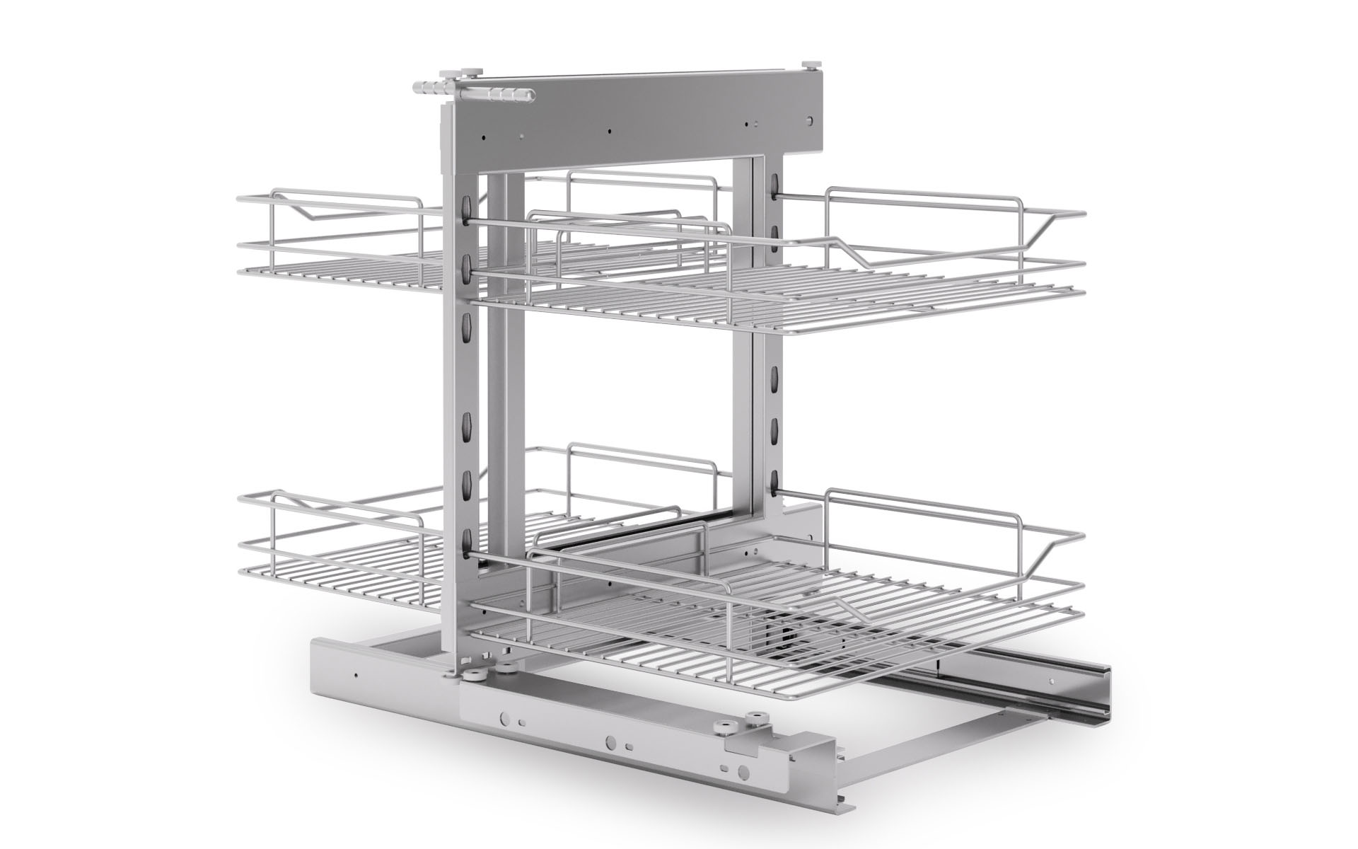 The system is available in various finishes: chrome, white, silver, or anthracite, and fits cabinet widths from approximately 800 mm to 1200 mm. For the front panel, you can choose between three door widths (420–450 mm, 470–500 mm, or 570–600 mm). The installation height is 585 mm.
