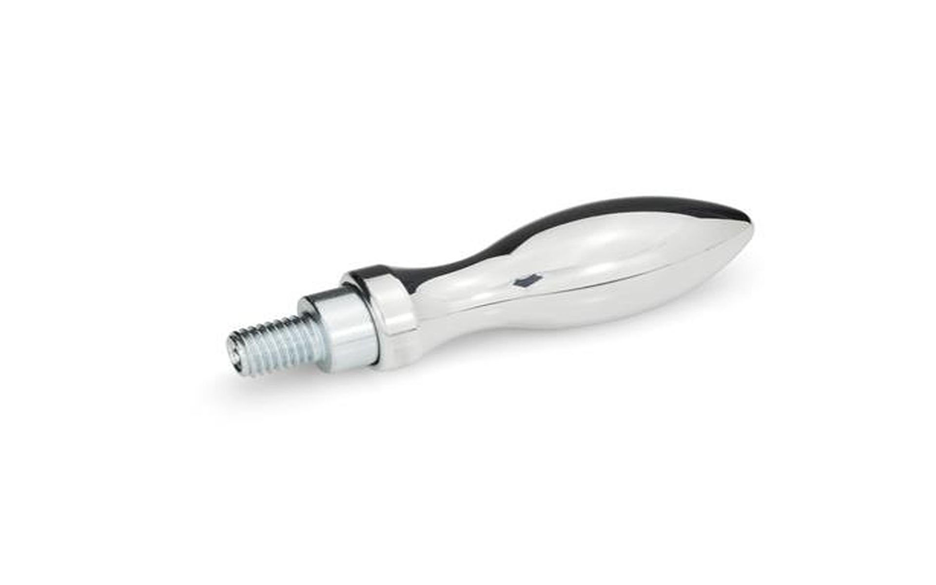 Swivel ball handles DIN 98 Form D are supplied unassembled, i.e. the handle part is enclosed loose. This means that the axle part can be pressed in or riveted separately. By lightly tapping with a soft-face mallet in the direction of the axle, the handle part is secured to the axle in such a way that it is held axially but remains rotatable.