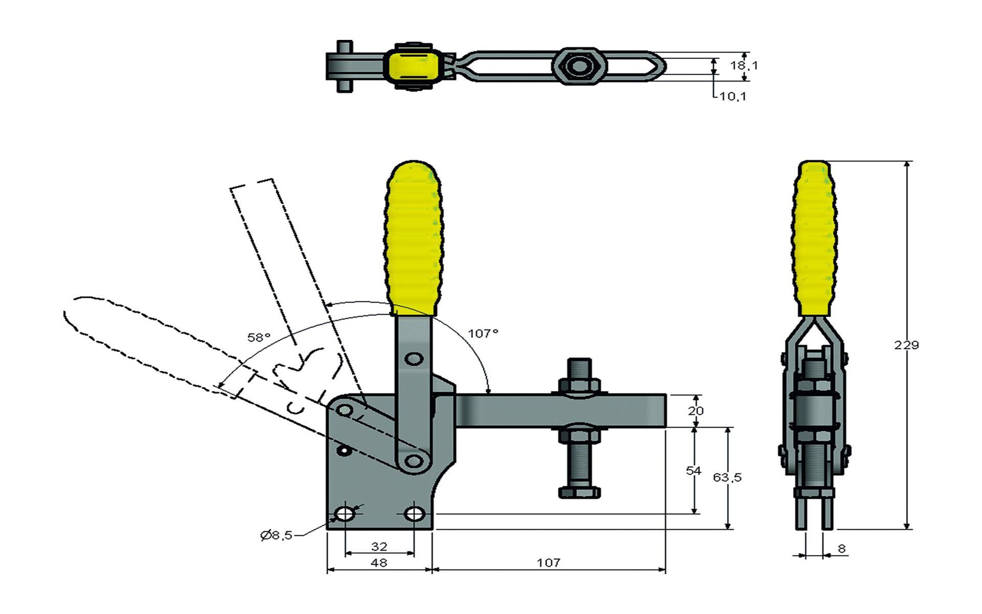Die Vertikal-Niederhalter-Spanner halten das Werkstück mit nach unten gerichteter Spannung mit maximalen Spannkräften bis 700 daN. Material: Schwerer Stahl; gehärtete Stifte und Buchsen Oberfläche: verzinkt